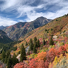 A young woman and man walking hand in hand outdoors on a sunny day, smiling at each other, in a garden with trees and colorful autumn foliage.