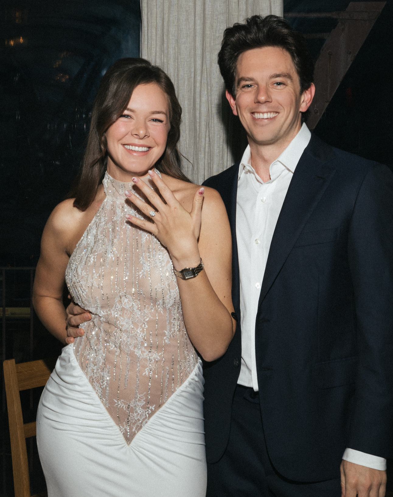 A young woman and young man standing close together outdoors, with the woman resting her hand on the man's chest, both looking at the camera, with blurred trees in the background.